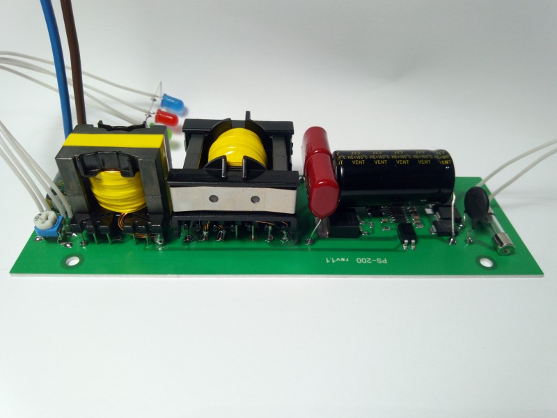Модуль перетворювача напруги з 220В змінного струму в постійний з функцією стабілізації напруги (CV), стабілізації струму (CC, в тому числі може працювати і на коротке замикання), захистом від перегріву - при 70 градусів зменшує потужність, при перегріві припиняє роботу, відновлює автоматично при охолодженні нижче 70 градусів. Максимальна потужність 200Вт (залежить від вихідної напруги). ККД 85-91%, залежно від вихідної напруги. Вхідна напруга 180-260В 50/60гц або 250-360В постійного струму. Індикатори: робота, режим стабілізації струму, перегріття. Має точне підлаштування вихідної напруги +- 5%. Пряме призначення - зарядка літій-іонних акумуляторів. Габаритні розміри: 154х50х31